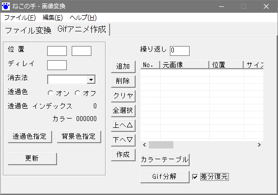 画像ファイルの形式・サイズ変換とGifアニメの作成・分解をおこなう このアプリケーションは (1)画像ファイルを、別の形式の画像に変換する (JPEGファイルをGIFファイルに変換ソフト詳細説明 1保存フォルダにパスを入力 (選択ボタンからの入力も可能) 2GIFファイルをドラッグアンドドロップでセット (追加ボタンからもセット可能) 3「一括GIF解体」のボタンをクリッ